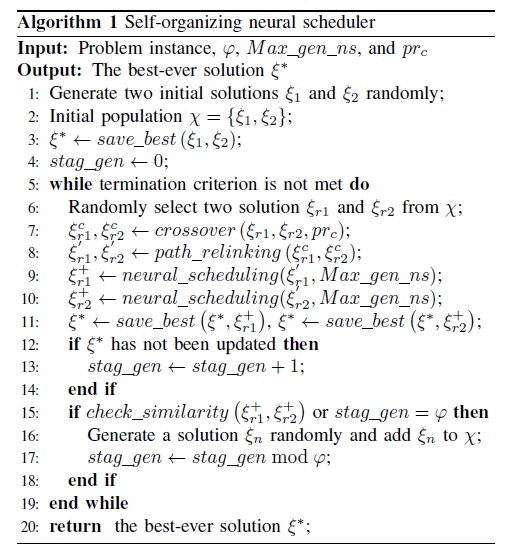 图3 SoNS算法总体流程 该算法1)首先随机生成规模较小的初始候选解集,解集中的每个解为一种调度方案;2)接着标记出当前最好的调度方案,即当前最优解;3)然后在迭代条件尚未满足时,从候选解集中任选两个解,经过交叉等操作生成新的候选解后,采用神经调度器(Neural Scheduler, NS)为选中的解提供改进方向;4)之后将产生的新候选解与当前最好解进行比较,保留较优的解。