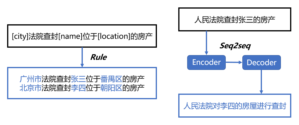 图4 基于噪声的数据增强方法示例 三、基于样例生成的方法 基于样例生成的数据增强方法将根据文本特征和任务特征进行新数据的生成。与基于语义替换的增强方法类似,样例生成使用规则和预训练模型来生成增强数据。不同之处在于,基于样例生成的方法是面向特定任务的,需要标签和数据格式等任务信息。样例生成方法不仅可以确保增强数据的有效性,还可以提升数据的多样性。该类方法基于人工启发式规则和训练好的模型来满足下游任务的需求,并且可以根据具体的任务需求进行设计,因此灵活性更强,但是实现难度更大。