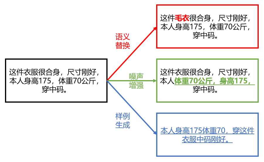 图3 基于遮罩语言模型的数据增强方法示例 对于特定领域的语料,使用基于启发式规则的方式进行数据增强更加可靠。一部分研究依靠现有词典或固定的启发式规则生成单词级和短语级的替换词;而另一部分研究将符合启发式规则的原始句子进行句子级别的转换,例如依赖句法树解析将主动句转换为被动句[2]。 随着机器翻译模型的发展和在线翻译API调用的普及,机器翻译作为数据增强方法也逐渐受到欢迎。其中,还原翻译方法是指将原始文档翻译成其他语言,然后再翻译回原始语言,以获得原始语言的新文本。与单词级别的方法不同,还原翻译不直接替换单个单词,而是以句子生成的方式重写整个句子。同样的,在多语言场景中,单向翻译也是有效的增强方法。与反向翻译不同的是,单向翻译直接将原文翻译成其他语言一次,而不将其翻译回原文。对于给定的输入语句,一些方法直接使用Seq2Seq模型生成新的句子,并以此训练模型输出更多样化的表达[3]。 二、基于噪声的方法 基于语义替换的数据增强方法会使增强数据的语义尽可能与原始数据相似,而基于噪声的方法则在训练时添加了不会严重影响语义的微弱噪声,以提升模型的泛化性能。人类可以通过对语法和先验知识大大降低弱噪声对语义理解的影响,但这种噪声可能会给模型带来挑战。因此,该类方法能够在扩大训练数据量的同时,提高模型的鲁棒性。 自然语言的语义对文本的顺序很敏感,但是对人而言轻微顺序变化后的句子并不会影响对语义的理解。因此,在合理范围内对单词甚至句子之间的随机交换可以作为一种数据增强方法,例如打乱文档内句子顺序以增强文档文本。同样的,根据下游任务特征,随机删除句子中的单词或删除文档中的句子,也能够提升模型对于完整语料的识别效果[4]。 与基于语义替换的方法类似,使用外部资源进行部分字符串替换也是常见的基于噪声的数据增强方法。对于与标签无关的词语或者具有相同标签语料的句子,可以通过将单词随机插入到句子中或将句子插入到文档中以提升模型的分类效果。例如使用英语中常见的拼写错误列表,生成包含常见拼写错误的增强文本,或者使用与任务相关的语料和关键句对原文本内容进行替换等。