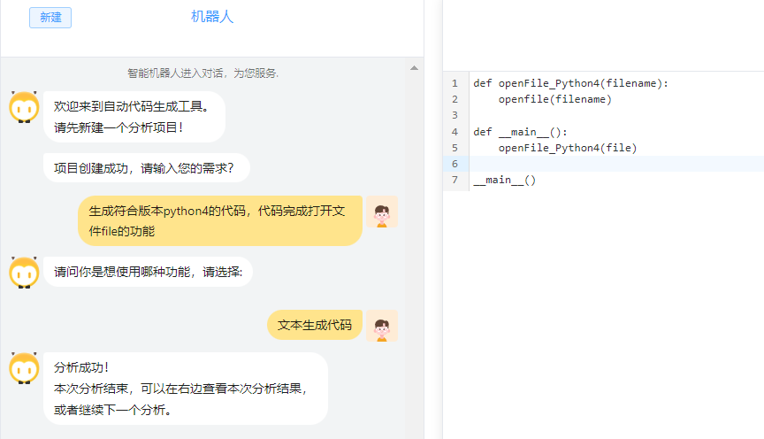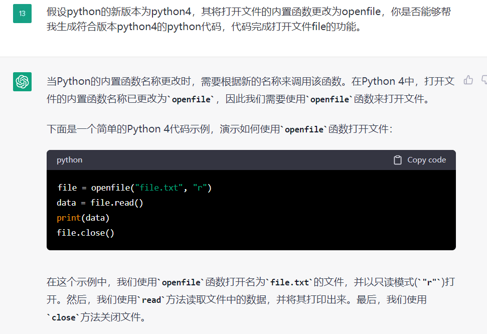 由 ChatGPT 与文码的反馈可知,两者均接收了内置函数open更改为openfile的新知识。接下来,我们在新对话中验证两个系统是否已经更新了编码知识以及能否将新知识用于后续的自动编码任务。 提问:生成符合版本 python4 的代码,代码完成打开文件 file 的功能