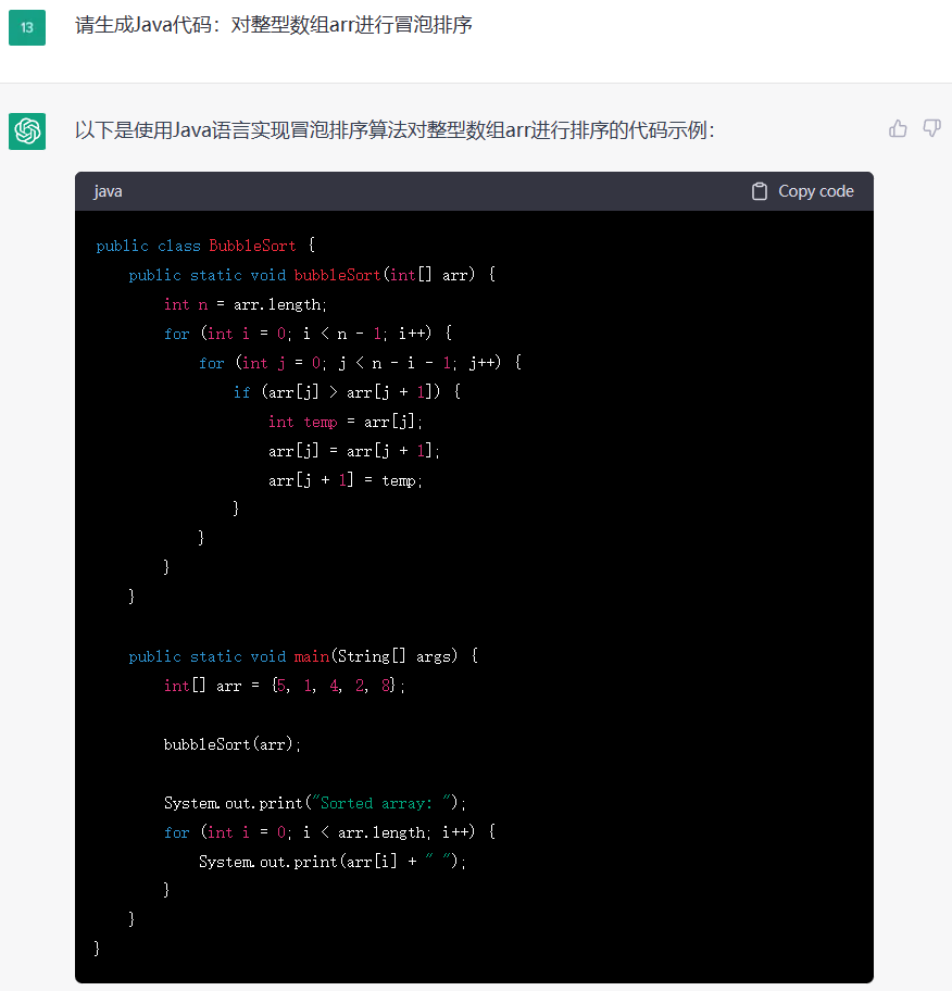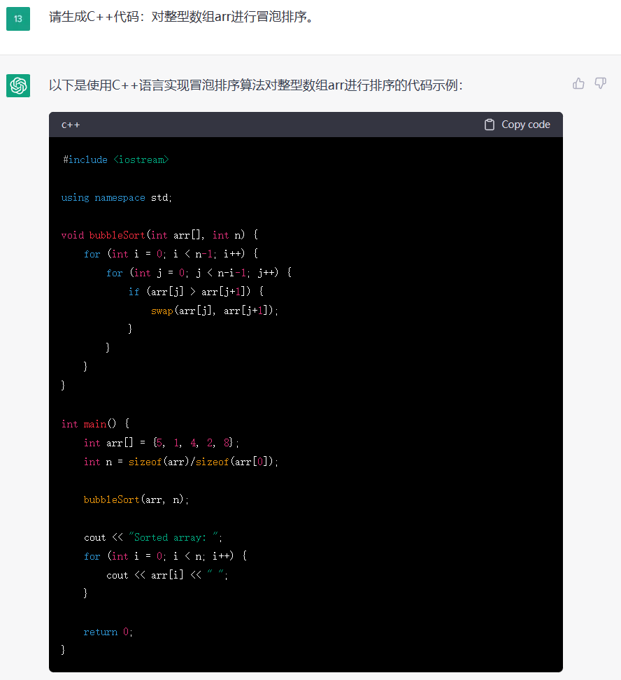 由以上结果可知,ChatGPT 虽然成功接收了新知识,但无法用于后续的自动编码任务。我们分析这可能是由于ChatGPT作为大规模模型,本质是从大规模训练语料中学习样本的统计规律,因此在不重新进行训练的前提下,难以实现知识的动态更新。而文码通过引入知识库的方式,能够在无需重新训练的前提下实现知识的动态更新,成功将新知识应用于后续的自动编码任务。 三、多语言可扩展性 从多语言的角度对比,文码支持C++、Java和Python三门编程语言的编码,ChatGPT支持大部分主流编程语言的编码。首先,我们对比了二者针对相同问题所自动生成的C++、Java和Python程序源代码。 提问:请生成C++/Java/Python代码:对整型数组arr进行冒泡排序
