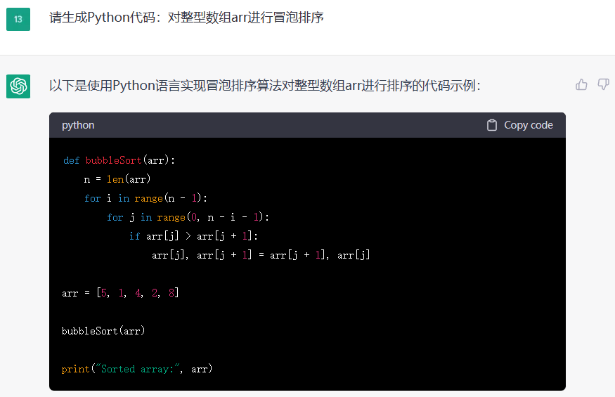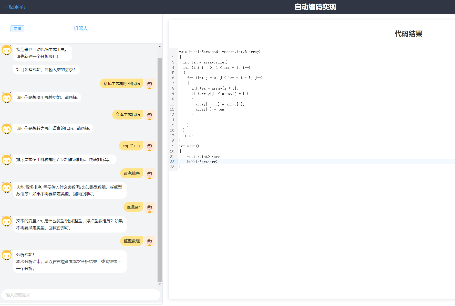 自动编码是一项机器根据用户给定的软件需求自动生成相应程序源代码的任务。它是一种提高软件开发自动化水平和产品质量的重要方法,一直受到学术界和工业界的广泛关注。智能算法研究中心一直致力于智能化软件工程的研究,近期研发了一款基于人机交互的代码生成系统——“文=码”系统(下文简称“文码”)。该系统首先对用户的软件需求进行语义解析,并通过对话的形式引导用户修正文本以削弱文本的二义性与 完整性,然后自动提取文本的程序逻辑,最终通过结合编程语言的语法规则来生成相应的程序源代码。而当前爆火的对话式大型语言模型ChatGPT也因擅长编程而“出圈”。面对同样的任务,我们的系统与ChatGPT谁能更胜一筹呢? 一、与用户需求的匹配度 提问:帮我生成排序的代码
