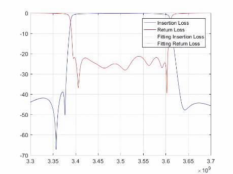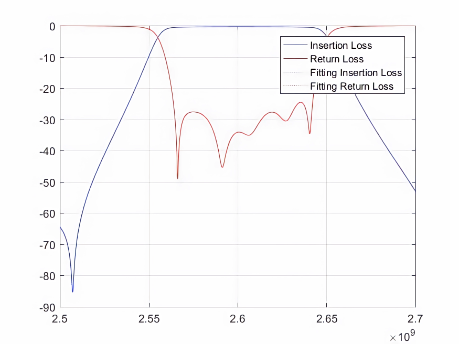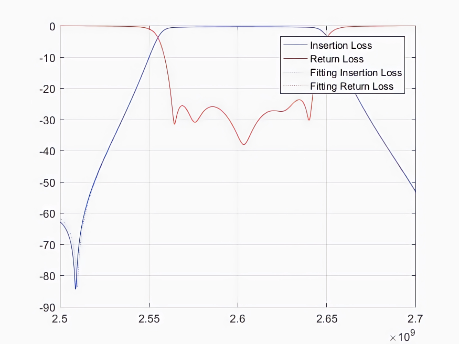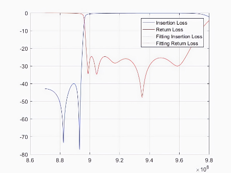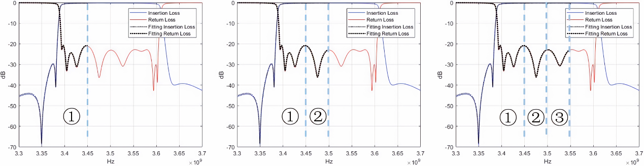 其中,红色和蓝色实线表示实际散射数据,虚线表示拟合的散射数据。实线和虚线的重合度越高就意味着自动微波滤波器的调优精度越高,也意味着该自动微波滤波器的质量越好。因此,该模型对于多版本的微波滤波器可行。