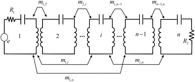 以图3所示两端口微波滤波器的通用原型网络为例,表示微波滤波器中谐振器的数量,、和是微波滤波器的基本电路元件。表示第个和第个谐振器之间的耦合系数。这些耦合系数组成的耦合矩阵(公式(1))反映了谐振器之间复杂的耦合关系。