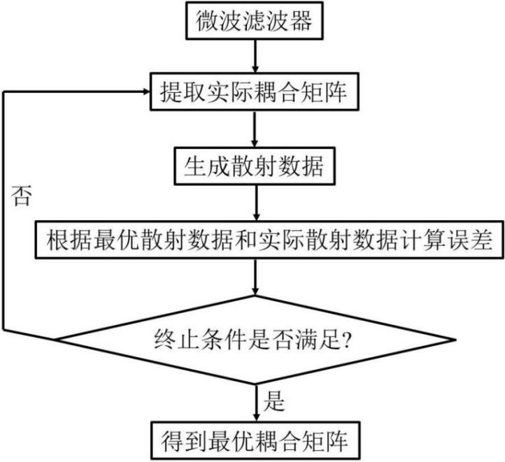 微波滤波器的自动调参过程如图2所示。因为每个微波滤波器的耦合矩阵各异,所以第一步是提取微波滤波器实际耦合系数的耦合矩阵。接着,将实际耦合矩阵与最优耦合矩阵转换的散射数据进行比较,根据二者误差计算下一次调参的方向及范围。之后不断重复此过程,直到实际耦合矩阵与最优耦合矩阵转换的散射数据相同时,就可以得到该滤波器的最适参数集,完成自动调参。