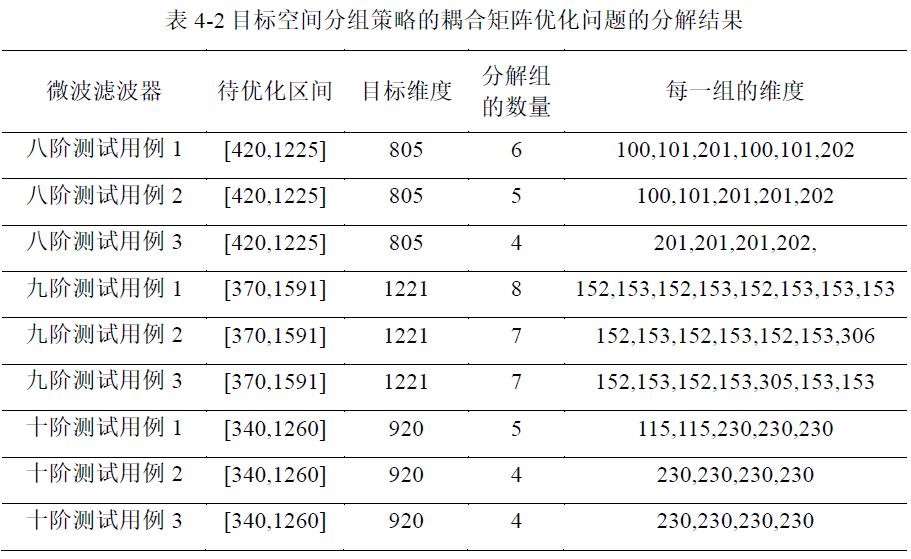 为对比目标空间分组策略的有效性,表1展示了本文所提分组策略在八阶微波滤波器、九阶微波滤波器和十阶微波滤波器上的分组结果。由表1可以看出,每个高维耦合矩阵优化问题都能分解为具有多个分组的低维优化子问题。这不仅意味着目标空间分组策略可以有效地分解具有强耦合性的复杂耦合矩阵优化问题,还表明频域子区间的相关性可以由相关系数矩阵来表示。