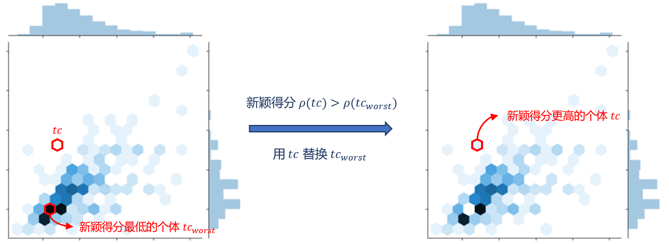 dSATNS根据NS算法采用了两种归档策略GlobalArch(见图3)和LocalArch(见图4),分别考虑了测试集的全局多样性和局部多样性。新颖得分是NS算法中的核心概念,度量个体所在区域的拥挤程度。新颖得分越高,说明个体所在区域越稀疏,反之则越密集。GlobalArch通过不断搜索新颖得分更高的个体并替换,提高了测试集的整体多样性,但忽略了新个体所在区域的局部信息。新个体的加入可能会导致出现局部聚集的现象,而在LocalArch的策略中,新测试用例及与其最近的测试用例不能同时存在,提高了测试集的局部多样性。