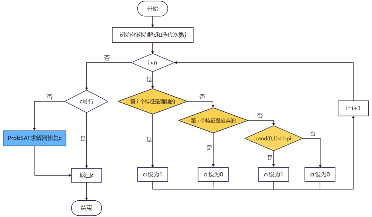 相似的SAT解;而dProbSAT则是研究人员提出的ProbSAT [4]的改进算法。如图2所示,dProbSAT借助概率向量产生一个多样化的初始解c,若c不可行,则调用原始的ProbSAT予以修复。作为一个通用框架,该算法适用于任何SLS类型的SAT求解器。