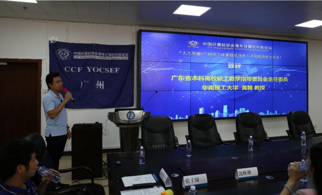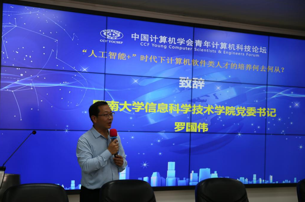 在本次论坛开幕环节中,暨南大学信息科学技术学院党委书记罗国伟首先致辞,向参加本次论坛的各位专家、学者表示热烈欢迎。罗国伟书记指出,在当前时代趋势下,开展“‘人工智能+’时代下计算机软件类人才的培养何去何从?”论坛的意义重大,期待此次论坛能激发更多针对我国计算机软件类教育的讨论及思考,暨南大学信息科学技术学院将继续积极关注和支持省软工教指委的各项活动和工作,愿意为教指委的发展贡献一份力量,为国家培养出更多高精尖人才,并预祝此次论坛取得圆满成功。