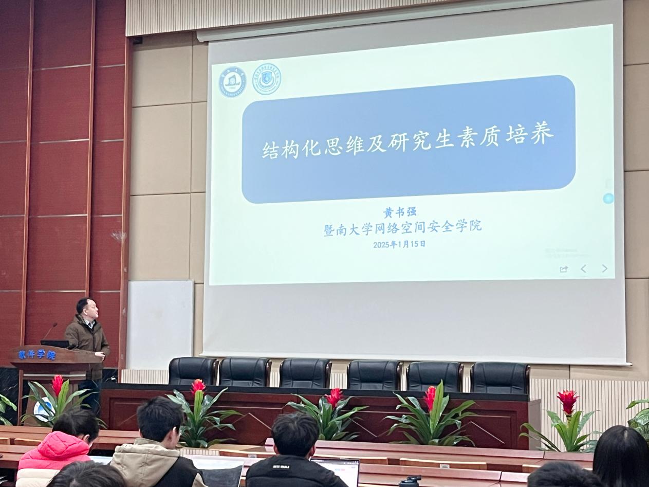 报告会伊始,暨南大学的黄书强教授作了题为 “结构化思维及研究生素质培养 ”的专题报告。黄书强教授开篇便从自身求学与科研历程中所面临的思维困境切入,生动地分享了自己在迷茫困惑中不断摸索,最终成功构建起结构化思维体系的亲身经历。<span style="font-family:宋体;font-size:16px;">紧接着,黄教授以论文撰写为例,细致地指导研究生如何借助结构化思维搭建起清晰严谨的文章框架,从精准提出问题、深入分析问题到高效解决问题,环环相扣、层层递进。此外,黄教授还指出,通过在学术研究、团队协作等多方面运用结构化思维,研究生能够高效梳理与规划各类事务,不断提升自身解决复杂问题的能力,进而顺利实现从知识的被动接受者向主动创造者的角色转变。