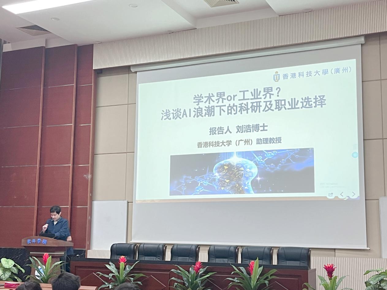 报告会上,香港科技大学(广州)的刘浩助理教授带来了一场主题为 “学术界 or 工业界?浅谈生成式 AI 浪潮下的研究生科研与职业发展” 的报告。刘浩助理教授首先追溯了人工智能的发展历程,从早期的简单算法模型逐步演进至如今复杂的智能深度学习体系,为听众清晰勾勒出其发展脉络。紧接着,他深入剖析了大型语言模型(LLM)所具备的卓越语言生成能力,以及其在艺术创作、专业知识应用等领域广泛而深远的应用场景。在探讨职业抉择时,他对比了学术界与工业界在工作环境、薪资待遇、发展前景等维度上的差异,并结合自身及同行的丰富经历,为研究生们提供了极具参考价值的建议,助力研究生规划未来科研与职业发展道路。