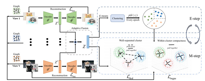 原文标题:Dual Contrast-Driven Deep Multi-View Clustering 原文作者:崔金荣, 李雨霆, 黄翰* , 文杰* 原文期刊:IEEE Transactions on Image Processing(CCF-A类Top期刊) 原文链接:https://ieeexplore.ieee.org/document/10648641 原文发表时间:2024年8月 摘要多视图聚类(Multi-view Clustering, MVC)方法利用来自不同视角的模态信息,为无监督学习提供更强的表达能力。然而现有方法往往难以同时满足“类间判别性强”和“类内结构紧凑”的聚类友好结构需求,最终导致聚类性能不理想。 针对这一问题,华南农业大学、华南理工大学和哈尔滨工业大学(深圳)研究团队联合提出了一种双对比驱动的深度多视图聚类方法(Dual Contrast-Driven Deep Multi-View Clustering, DCMVC),通过引入类间对比的簇扩散机制(Dynamic Cluster Diffusion, DCD)和类内对比的可靠邻居正向对齐机制(Reliable Neighbor-Guided Positive Alignment, RNGPA),同时优化类间分离性和类内紧凑性。 该方法在多个典型多视图数据集上进行了验证,实验结果表明:所提DCMVC方法在聚类准确率(ACC)、归一互信息(NMI)和F-score等指标上均显著优于现有主流方法。相关源代码与实验配置已开源,访问地址为: GitHub:https://github.com/tweety1028/DCMVC