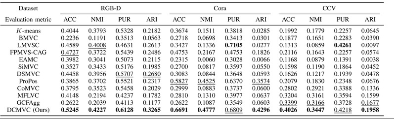 图1 DCMVC整体框架图 整体方法由四个关键组件组成: 1)视图特定自动编码器:提取高阶视图特征,保持视图特异性; 2)自适应特征融合模块(AFF):基于可学习权重融合多视图表征,提升信息整合质量; 3)动态簇扩散模块(DCD):引入簇中心对比损失,增强类间分离性; 4)可靠邻居引导正样本对齐模块(RNGPA):结合伪标签与邻居结构,消除伪负样本,增强类内紧凑性。 实验结果: (1)性能对比 如表1所示,DCMVC在多个数据集上显著优于现有方法: